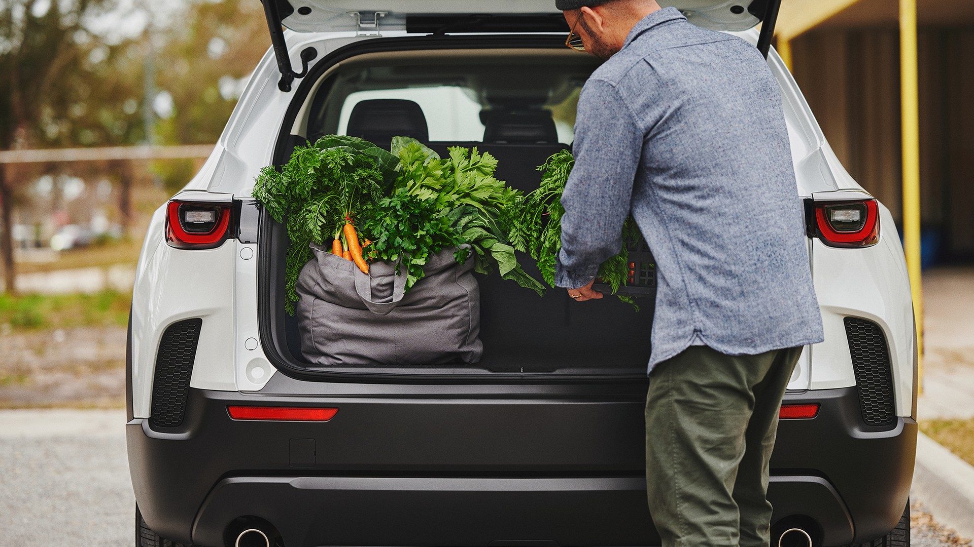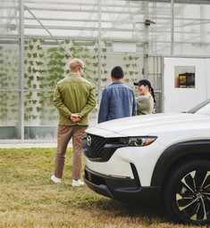 The appeal, Ferrell explains, is the quality of the product, and knowing it was grown locally with zero pesticides. “It’s an incredible facility, and technology is at the forefront,” he says. “What they’re producing is nothing short of amazing.” Picking up a handful of Fresno chili peppers, a pinch of green basil, which will be dehydrated and ground to powder, and some marjoram, parsley, and petite basil, Ferrell maps out the next stages of the meal. There’s also plenty of room in the cargo space to stow all our hyperlocal ingredients, a task made easier with the Mazda CX‑50 Hybrid’s Rear Power Liftgate.