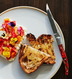 The stage is set. “The menu starts with the roasted Chioggia beets, which I’m serving with goat’s milk ricotta, and some pickled gooseberries,” says Ferrell, as he uses a pair of chopsticks to carefully place the garnish. To accompany the dish, he serves two slices of sourdough from local Tampa bakery Jamison B Breadhouse.