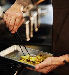 Before we head to the kitchen, there’s one final stop: Meacham Urban Farm, in the heart of Tampa. As we close in, I flick the Mazda CX‑50 Hybrid into EV mode, traversing the city streets quietly and confidently. Meacham Urban Farm uses urban regenerative agriculture as a way to both feed and educate the community of Tampa Bay, producing over 30 varieties of organic fruits and vegetables in the heart of the city. It’s here that Joe Dalessio, with his team, transformed an empty two-acre lot, once peppered with scrub trees and little else, into a thriving oasis of regenerative farming. “To me, food is culture,” says Joe. “It’s the foundation of what culture is. I love growing good food and doing that for my community.” He picks the perfect Chioggia beets for our recipe and helps us pack away our final set of ingredients into the Mazda CX‑50 Hybrid, before we head back to the kitchen and park up. The beets, Ferrell explains, will be paired with whipped ricotta cheese, pickled gooseberries, and edible flowers. I rifle through our ingredients, while Ferrell sharpens his set of Japanese knives. Behind him, machines click and whirr into life.