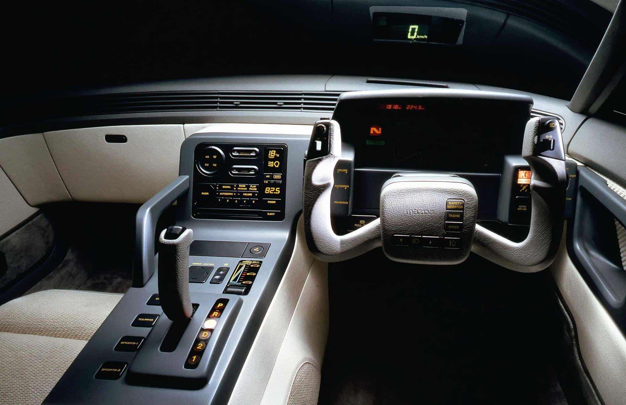 Mazda threw the kitchen sink at the MX‑03 concept, which boasted a huge spec and enticing list of innovations. The four-seater coupe featured four-wheel drive, a triple-rotor 315 hp engine, four-wheel steering, a head-up display, and an aircraft yoke steering column instead of a regular wheel.