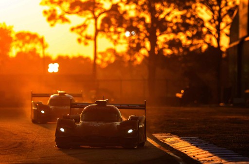 “There are a few different really awesome spots to shoot sunset at Sebring, but I kind of find myself coming to this one a lot just because it’s really pretty. The cars are coming straight at me here before they go into a tight turn so they’re on the brakes, but they’re going at quite a pace. I used a 400mm lens for this image, shooting through the fence. This was a lucky shot because a lot of the time there are cars or trucks in the background.”